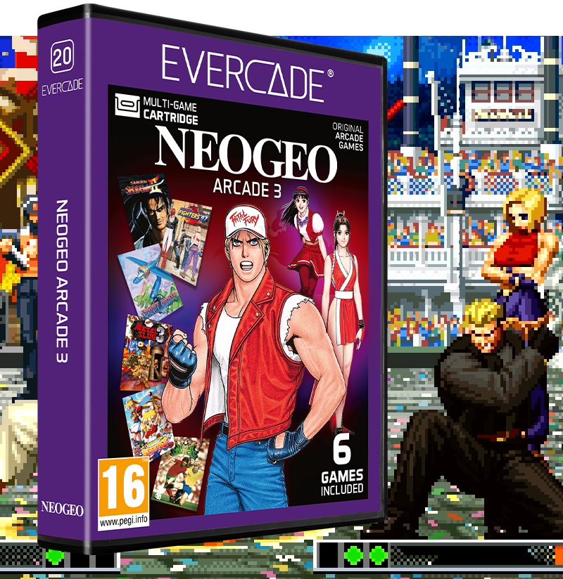 A NEOGEO Arcade 3 most először hoz hat újabb NEOGEO legendát az Evercade-re. Bizonyítsd be harcművészeti képességeidet a THE KING OF FIGHTERS '97 és a SAMURAI SHODOWN II verekedős játékklasszikusokban, verd vissza az idegenek csínytevéseit a METAL SLUG 3-ban, sajátítsd el a TWINKLE STAR SPRITES innovatív, versenyképes lövöldözős játékát és még sok mást!